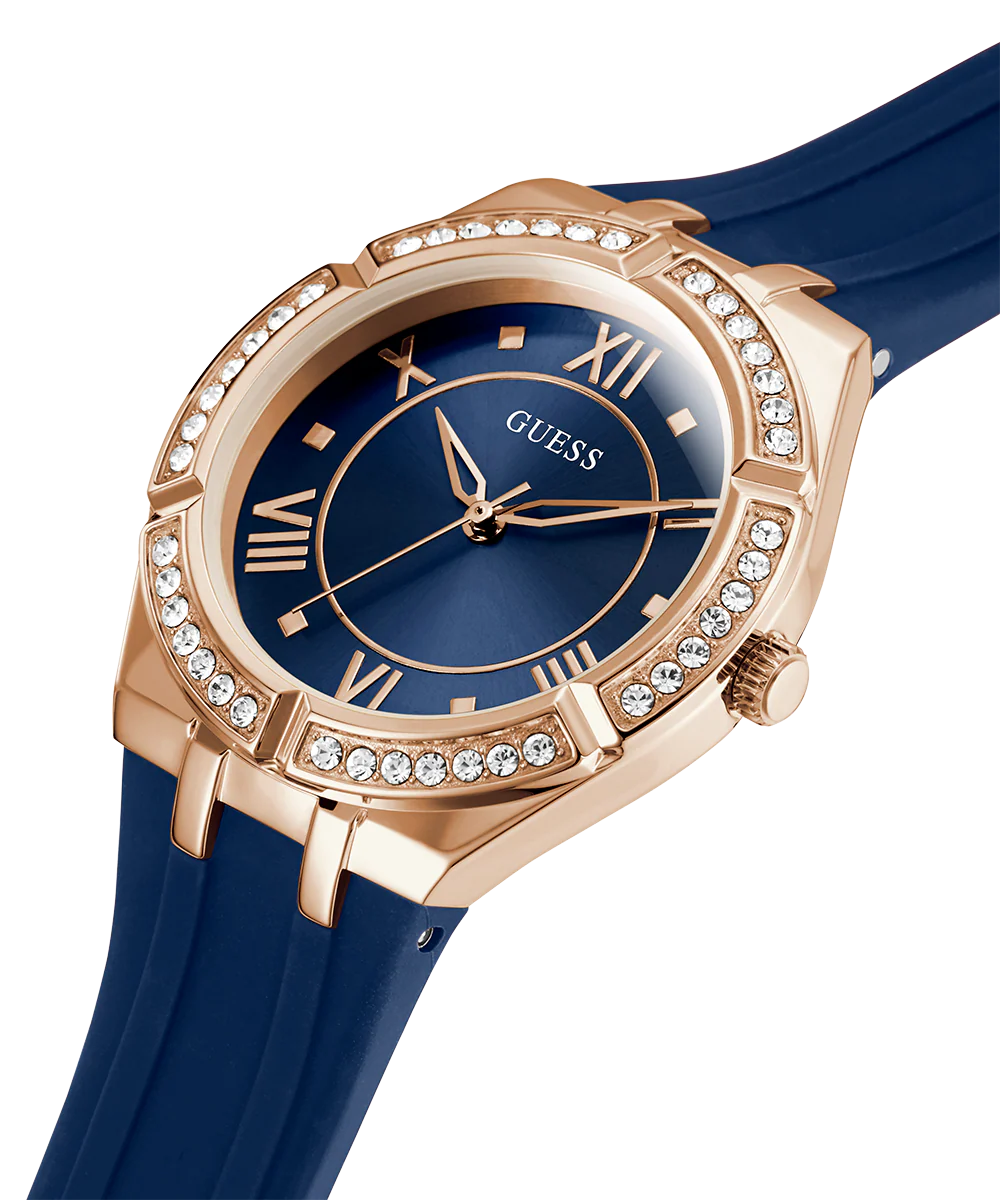 GUESS Ladies Blue Rose Gold Tone Analog Watch—