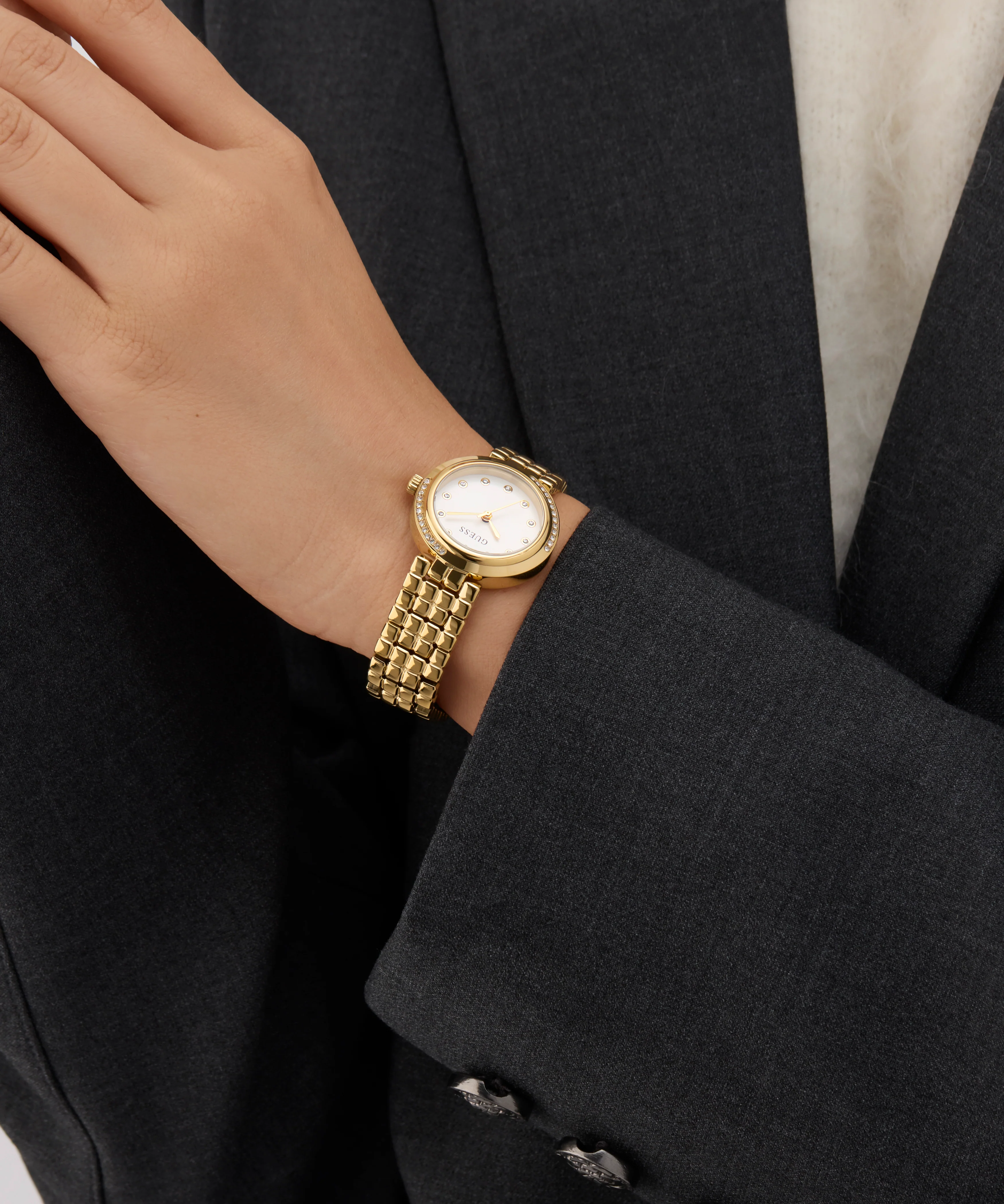 Exude elevated elegance with this beautifully crafted timepiece! This pretty 28 mm gold case showcases asymmetrical crystals on its bezel and is paired with a unique and beautiful bead-textured polished stainless steel gold bracelet. A crisp white sunray dial ties the look together!