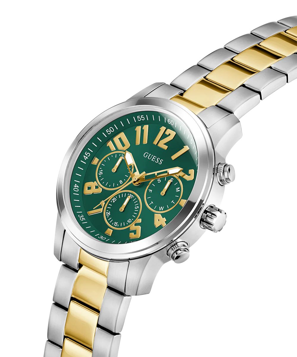 The New Standard of Sharp Cut clean and built to stand out, this men’s 44mm timepiece combines a green dial with a brushed and polished two tone stainless steel case and bracelet. The bold three subdial multifunction layout balances precision and presence, bringing a modern edge to a classic sport silhouette. The bright green dial adds depth and contrast, catching the light with every move for a look that feels both confident and elevated. Strong numerals and refined markers keep the design sharp, while the steel bracelet grounds everything in durability and style. Engineered for versatility, this watch blends sport influence with polished sophistication, creating a piece that looks just as at home in the boardroom as it does off duty. A standout design made for the man who leads with clarity, confidence, and unmistakable style.
