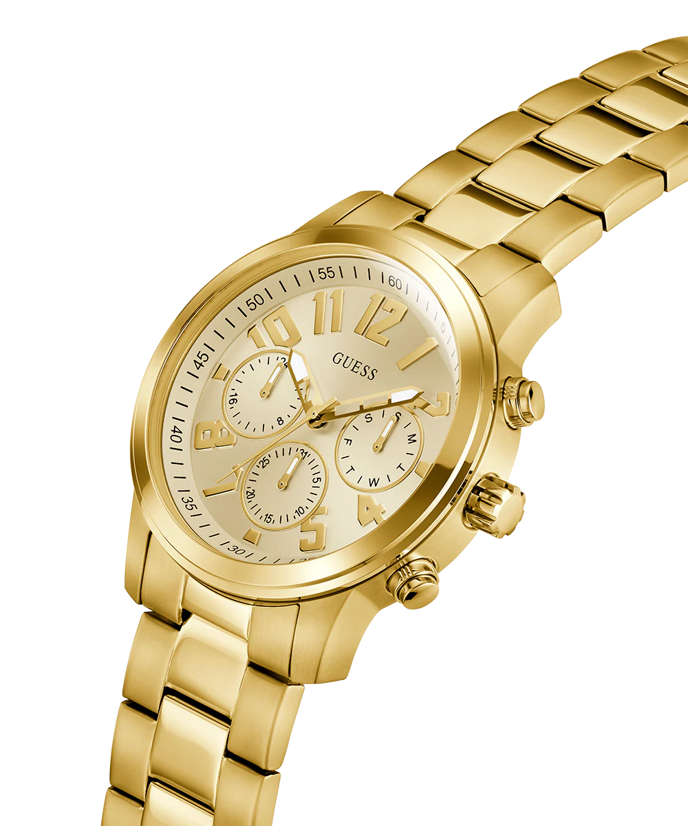 The New Standard of Sharp Cut clean and built to stand out, this men’s 44mm timepiece combines a champagne dial with a brushed and polished gold tone stainless steel case and bracelet. The bold three subdial multifunction layout balances precision and presence, bringing a modern edge to a classic sport silhouette. The bold champagne dial adds depth and contrast, catching the light with every move for a look that feels both confident and elevated. Strong numerals and refined markers keep the design sharp, while the steel bracelet grounds everything in durability and style. Engineered for versatility, this watch blends sport influence with polished sophistication, creating a piece that looks just as at home in the boardroom as it does off duty. A standout design made for the man who leads with clarity, confidence, and unmistakable style.